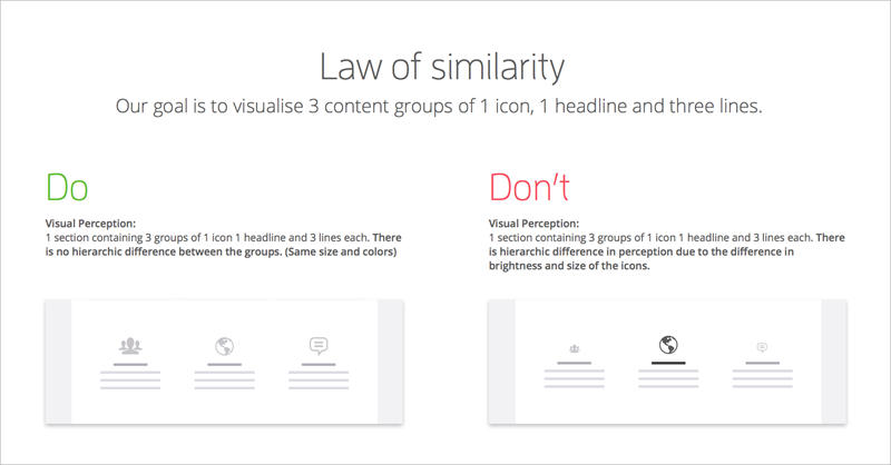 “相似性法則”表明外表相近的元素會(huì)被視為一組。也就是說(shuō)如果有著相同功能、意義或?qū)蛹?jí)的元素應(yīng)當(dāng)視為整體。