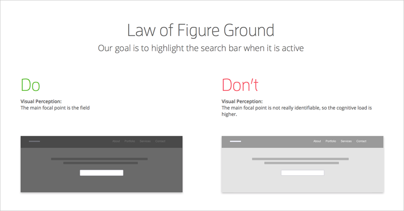 「主體 / 背景法則」表明“元素視為文字(不同的重點(diǎn))或區(qū)域(文字后面的背景)間的對(duì)比”,由Andy Rutledge提出。當(dāng)我們想要在屏幕中強(qiáng)調(diào)某點(diǎn)的時(shí)候這條非常有用。