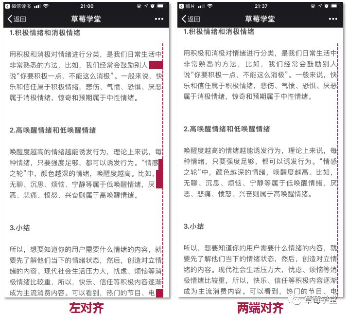 還有一個和左對齊很類似的對齊方式:兩端對齊,相比于左對齊,兩段對齊的文字邊緣更整齊,視覺效果更好,所以,在新媒體營銷技巧——新媒體排版中一般用兩端對齊代替左對齊: