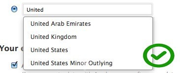 輸入”United”,會(huì)自動(dòng)補(bǔ)全國(guó)家名稱顯示在列表里小結(jié):當(dāng)選項(xiàng)超過15個(gè)時(shí),考慮使用文字輸入框(帶有或不帶自動(dòng)補(bǔ)全功能),而不是下拉菜單。選項(xiàng)太少如果選項(xiàng)少于7個(gè)時(shí)采用下拉菜單,預(yù)先展示出來的選項(xiàng)就少了。用戶需要點(diǎn)擊下拉菜單才可以看到其他選項(xiàng)。