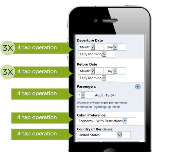 左圖中每個(gè)問題都采用下拉菜單框。右圖中每個(gè)問題都使用最恰當(dāng)?shù)目丶栴}一:操作數(shù)量移動(dòng)端和PC端的下拉菜單的交互是分步驟的,會(huì)耗費(fèi)更多的精力。下圖就是前面的例子中需要使用下拉菜單來完成的操作: