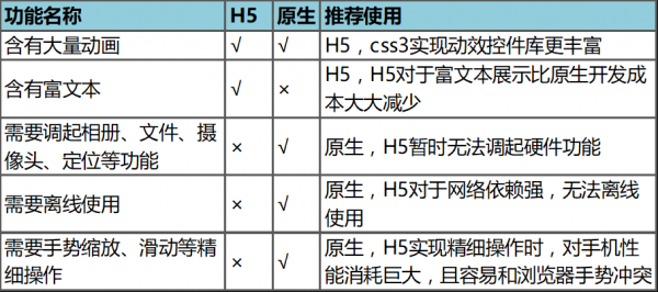 但仍然有些技術(shù)壁壘由于平臺(tái)性能等無法攻克,下表列出了H5和原生能實(shí)現(xiàn)的常見功能及推薦,在遇到面臨包括此種功能的需求時(shí),可以直接據(jù)此判斷用何種技術(shù)來實(shí)現(xiàn)。
