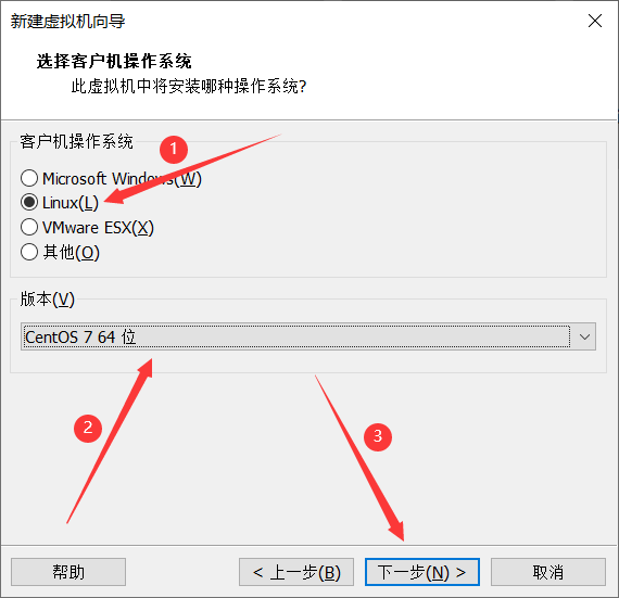 4、操作系統(tǒng)類型選擇“Linux”,版本選擇“CentOS 7 64位”,下一步: