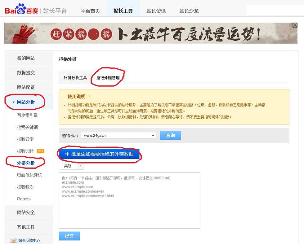 如果出現(xiàn)了這樣的現(xiàn)象,你也不要太緊張,因?yàn)榘俣纫蚕氲搅耍憧梢酝ㄟ^遞交拒絕外鏈的數(shù)據(jù)來維護(hù)你的網(wǎng)站。具體辦法是打開百度站長(zhǎng)工具,注冊(cè)登陸之后添加你的網(wǎng)站,然后點(diǎn)擊網(wǎng)站分析――外鏈分析――拒絕外鏈管理――批量添加需要拒絕的外鏈數(shù)據(jù),如圖所示: