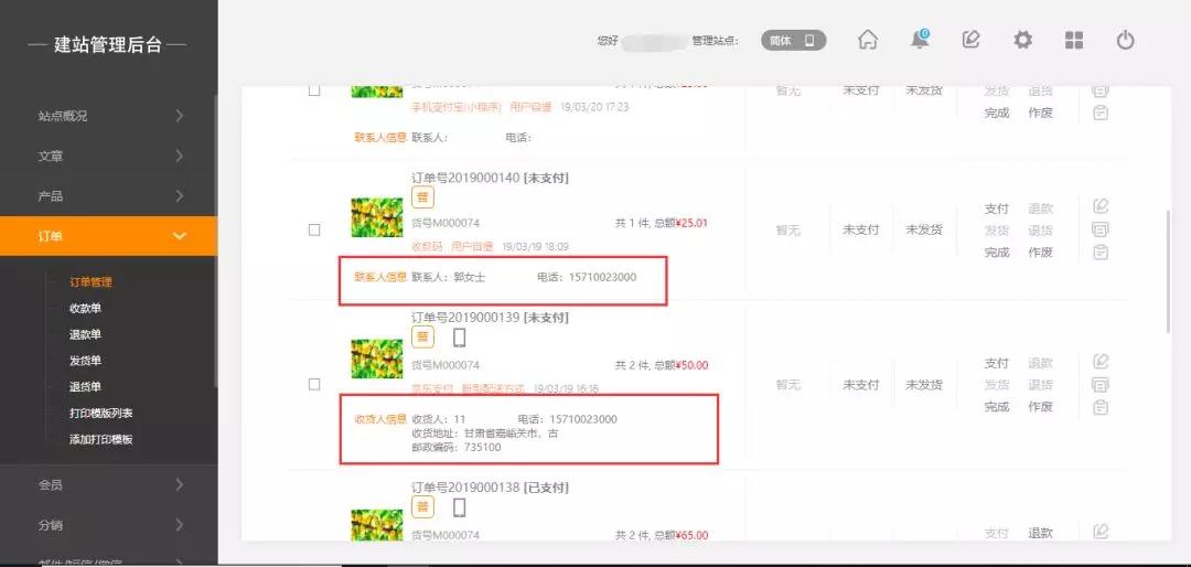 在建站后臺的訂單管理中,客戶的訂單信息(聯(lián)系人、聯(lián)系電話、地址等)均在訂單管理首頁顯示