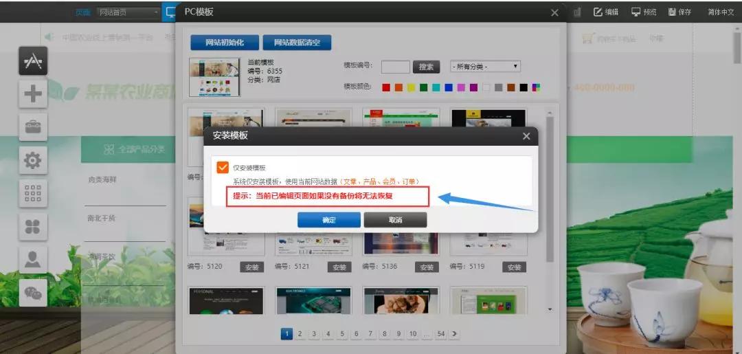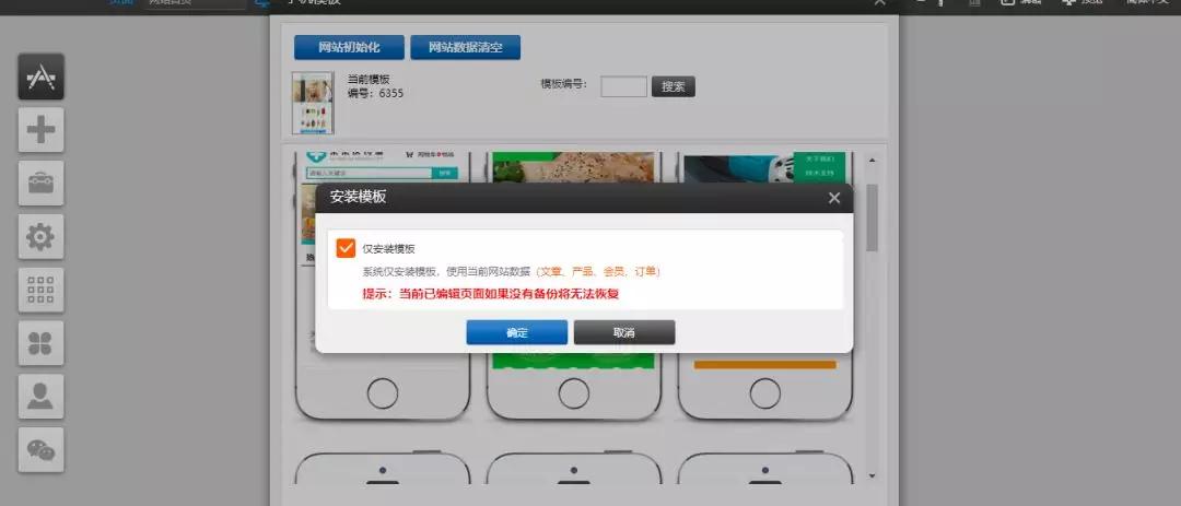 編輯器中點擊模板,選擇模板點擊安裝,會有提示信息“當前已編輯頁面如果沒有備份將無法恢復”,提醒客戶:在安裝模板前如果有需要請先備份當前編輯頁面