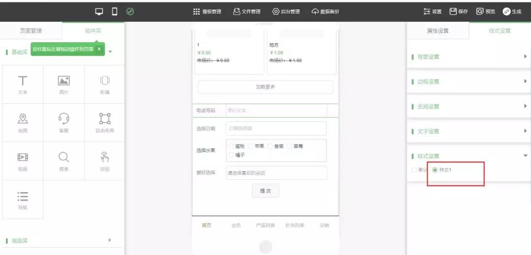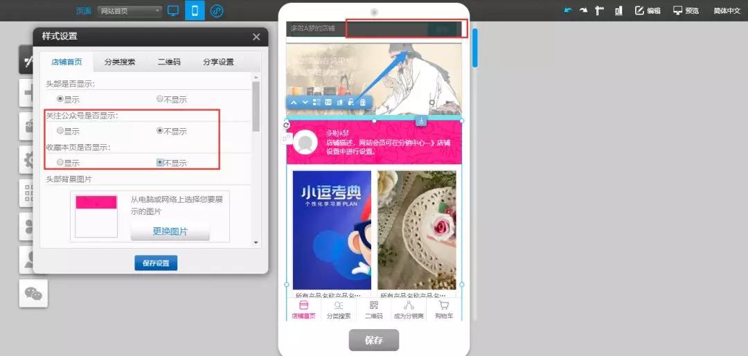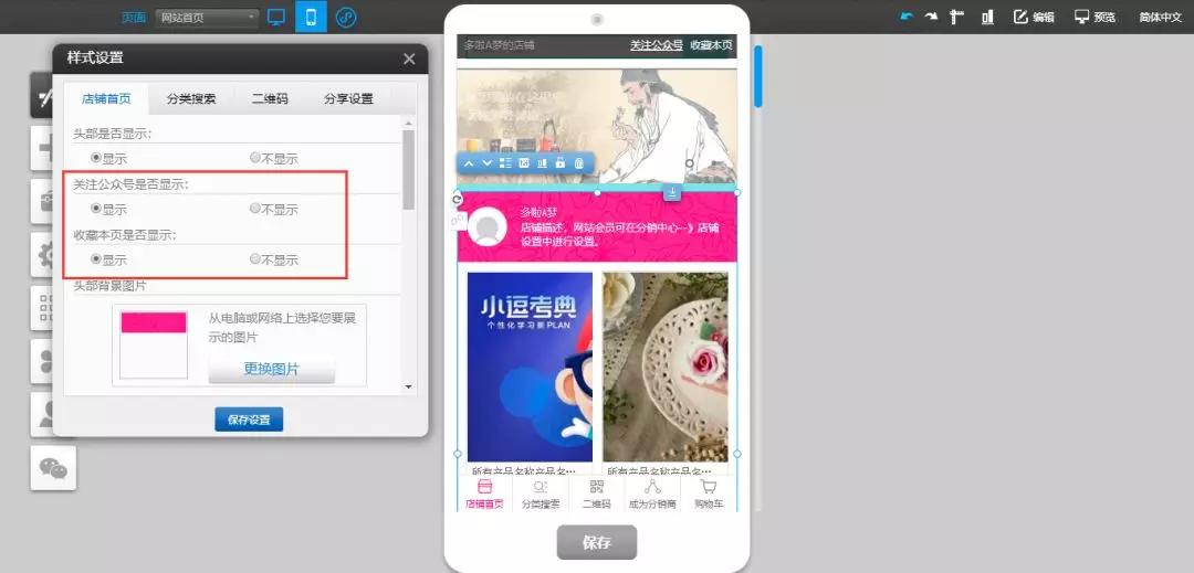 在手機編輯器中點擊分銷店鋪,點擊“樣式設置”,選擇“關注公眾號”以及“收藏本頁”是否顯示