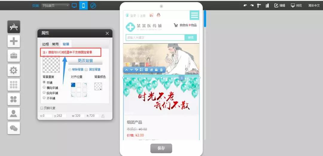 建站編輯器中的插件中屬性設置—背景優(yōu)化(增加提示),由于UC與微信瀏覽器不支持固定背景,因此需要謹慎使用該設置項