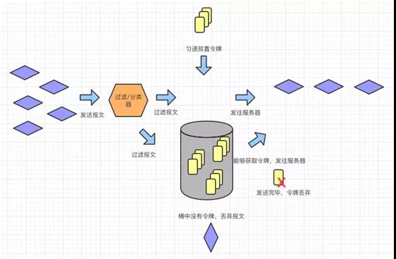數(shù)據(jù)報到來時從桶中取令牌,如果桶中有令牌,憑借令牌處理請求,處理完畢令牌銷毀;數(shù)據(jù)報到來時發(fā)現(xiàn)桶中沒令牌,該請求將被拒絕。
