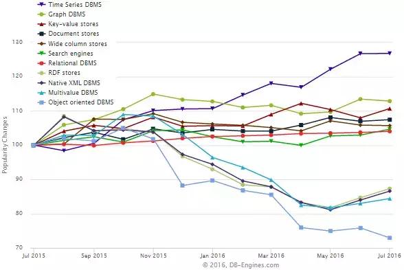 其實(shí)從2016年開始就有了這個趨勢,引用一下DB-Engines上發(fā)布的一張圖,在2016年12個月里,TSDB的人氣上漲了26%,是排名第二的圖數(shù)據(jù)庫的兩倍還多。