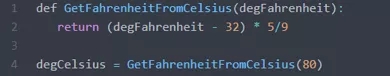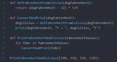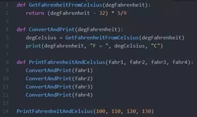 更清爽對(duì)吧!代碼看起來(lái)更干凈、更簡(jiǎn)潔。而且,它比前一個(gè)示例更具描述性。那個(gè)公式只會(huì)在定義ConvertAndPrint函數(shù)時(shí)出現(xiàn)一次。如果只是想把華氏度轉(zhuǎn)換成攝氏度但是不顯示這些數(shù)據(jù)呢?可以通過(guò)定義不同的函數(shù)來(lái)實(shí)現(xiàn):