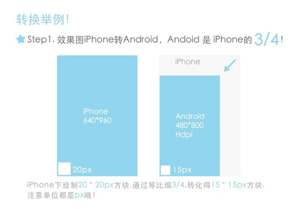 IPhone下繪制20*20像素方塊,轉(zhuǎn)換成Android需要縮小到三分之四得15*15像素,再通過公式1dp=3/2px.成功轉(zhuǎn)化單位得10*10dp,由20px轉(zhuǎn)化成了10dp1。