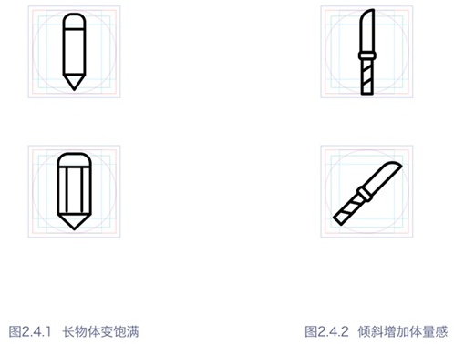 那么,以上的參考線應該怎么使用?我們畫圖標的時候,物體會有長有扁,有圓有方,在統(tǒng)一體量感的時候,就需要用到里面的一些參考線。但是記住,參考線是死的,人眼是活的,畫完以后,要靠感覺微調,直至視覺上體量感達到一致。請看下圖2.2.3分析: