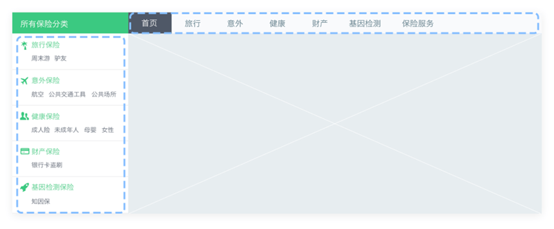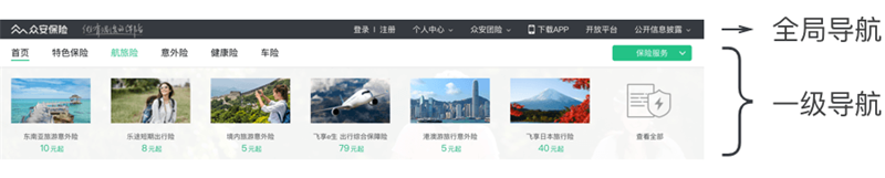 網(wǎng)站起初定位是互聯(lián)網(wǎng)保險(xiǎn)電商網(wǎng)站,所以選擇了適用于繁雜內(nèi)容展示的“雙重導(dǎo)航”設(shè)計(jì),這也是電商平臺常用的導(dǎo)航方式。但由于保險(xiǎn)類商品數(shù)量不像京東、淘寶平臺這樣巨大,我們發(fā)現(xiàn)導(dǎo)航系統(tǒng)需要根據(jù)現(xiàn)狀進(jìn)行梳理優(yōu)化,作出相應(yīng)的調(diào)整,使得導(dǎo)航更明確、更簡潔。