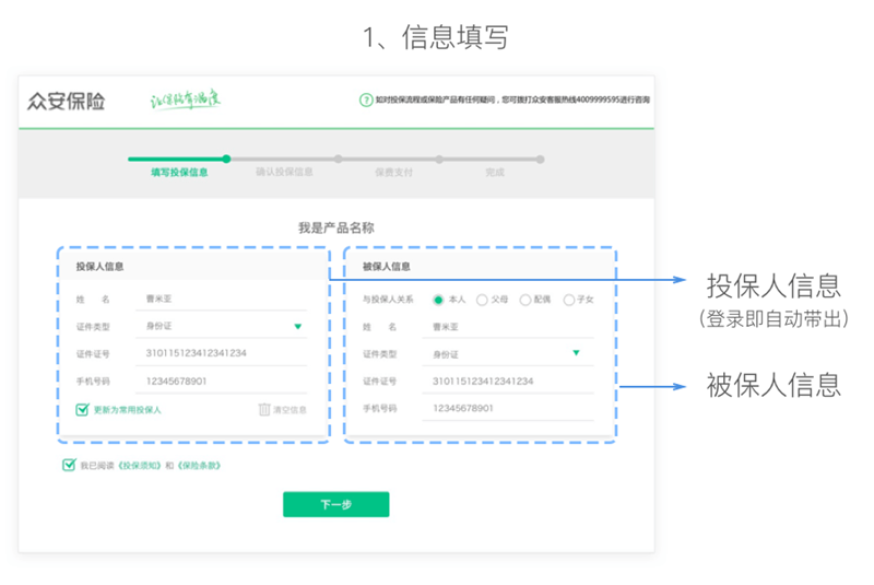 改版后,已登錄的注冊用戶進(jìn)行投保可調(diào)用預(yù)留信息。在最簡情況下,只需一個勾選操作即可進(jìn)入“下一步”。