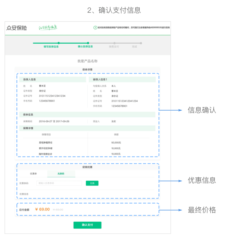 出于行業(yè)的嚴(yán)謹(jǐn),我們依然保留了信息復(fù)核的流程,但仰賴電腦端網(wǎng)頁的充分空間與合理的視覺排版,保單信息與優(yōu)惠信息的合并顯示也并不對用戶造成太多信息認(rèn)知負(fù)擔(dān)。
