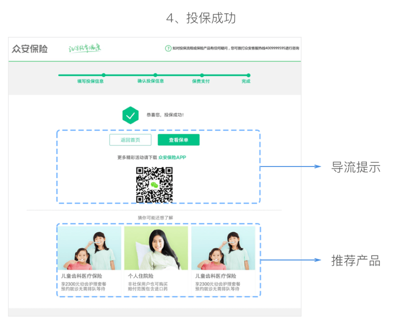 投保成功頁則進(jìn)一步完善了導(dǎo)流信息及同類產(chǎn)品推薦功能,為用戶提供了更明確的可前往路徑。