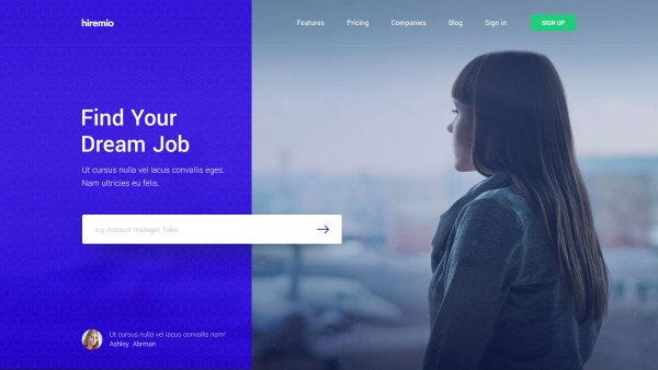 △ 左右分屏是最近一年比較流行的布局方式之一,這種布局能夠更加強調品牌的色彩調性,避免圖片與文字的疊加干擾閱讀,帶來的問題就是中間死板的分割線,設計師將輸入框橫跨了兩個模塊,巧妙地打破了這個死板的形式