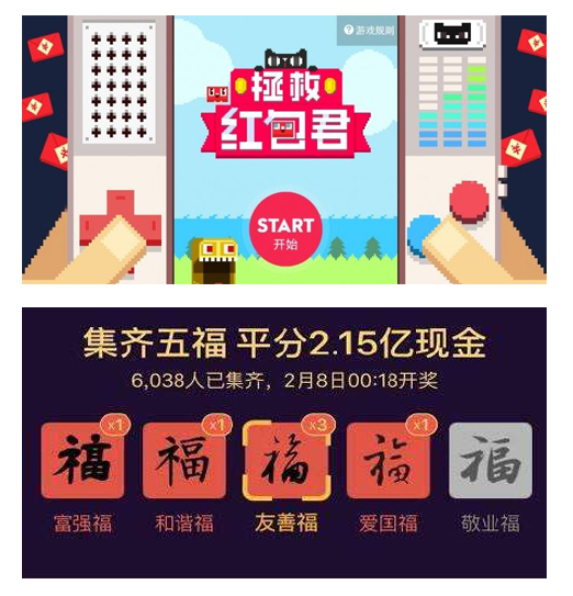 準(zhǔn)備了多輪的紅包雨,以游戲的形式進行發(fā)放,“雙11紅包抽獎”“與天貓拔河獲取紅包”等等。主動付出,概率性回報,累計反饋,這是游戲具有成癮性的根本,而紅包游戲的設(shè)計更是嚴格根據(jù)這3點來設(shè)計,最后取得了良好的效果。