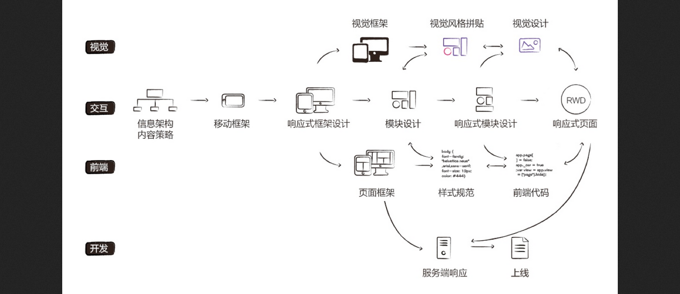 響應(yīng)式設(shè)計之所以叫響應(yīng)式“設(shè)計”而不叫響應(yīng)式“技術(shù)”,是因為它是一項設(shè)計先行的工作。需要設(shè)計先明確好響應(yīng)方式再實現(xiàn)出來,不能出一套設(shè)計稿后等著前端看情況把它變成響應(yīng)式網(wǎng)頁。所以整個流程最初從交互階段開始,分成6個主要步驟,視覺、前端、開發(fā)等角色根據(jù)情況盡早介入。