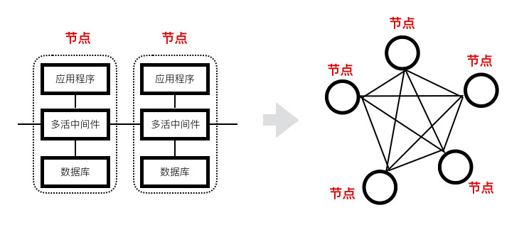 如下圖所示,每個(gè)AlAisc多活中間件上下分別連接著應(yīng)用程序和數(shù)據(jù)庫(kù),而各個(gè)中間件左右相互連接,將原本分散的節(jié)點(diǎn)形成一個(gè)共識(shí)網(wǎng)絡(luò),在這個(gè)網(wǎng)絡(luò)中,節(jié)點(diǎn)沒(méi)有主次或主備之分。
