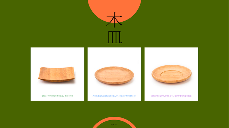 2.圖片(圖形),其實(shí)是較為統(tǒng)一的木色,但是上下兩部分的“圓形”卻使用了比較亮眼的橙色,抹殺了寫真本身的顏色,雖然達(dá)到了吸引人的亮眼氛圍,卻給人一種輕率不穩(wěn)重的印象。