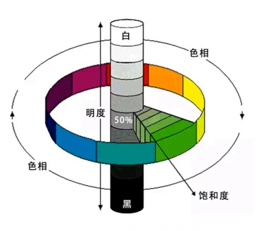其實(shí)可以簡單的理解為一個(gè)以色相環(huán)為基礎(chǔ)變化成的一個(gè)圓柱體,圓柱體的側(cè)面分布了整個(gè)色相環(huán);圓柱體的底面到頂面,色相環(huán)的亮度發(fā)生變化;圓柱體的軸心到側(cè)扁表層,純度發(fā)生變化。