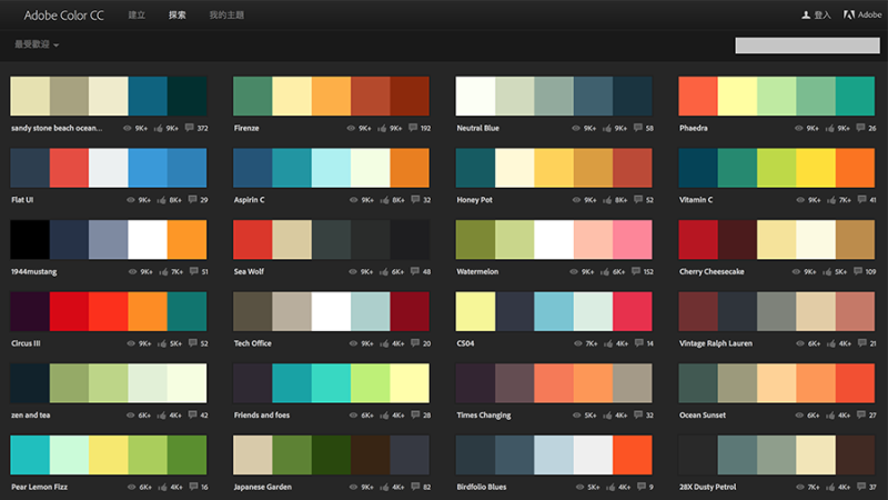 它的原名更為著名,也就是Kuler ,不知道什么時(shí)候開始改了名字,不過功能沒有發(fā)生太大的變化。這是一個(gè)由設(shè)計(jì)師分享配色方案的一個(gè)平臺,已經(jīng)保存了成千上萬的預(yù)制配色方案。在photoshop上自帶了一個(gè)插件,你可以直接調(diào)用上面的色彩方案,并且非常方便的應(yīng)用到你的設(shè)計(jì)稿中去。