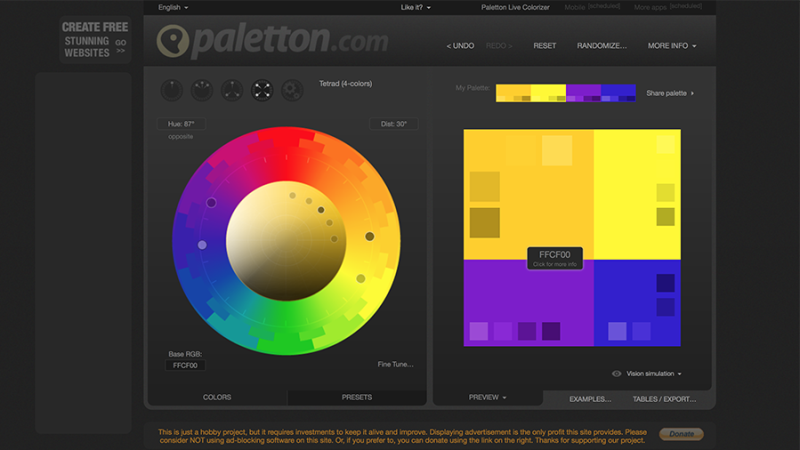 我經(jīng)常使用這個(gè)網(wǎng)站用于,我只確定了一個(gè)主色的情況下,它能幫助我擴(kuò)展這個(gè)色彩,搭配出數(shù)種方案,甚至還有色盲修正方案。如果你只能確定一個(gè)必須使用的顏色,選擇這個(gè)工具或許能獲得一些靈感。