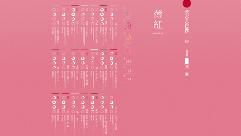 這個(gè)網(wǎng)站專門列舉了 250 種日本傳統(tǒng)色,且擁有了不錯(cuò)的動畫過度效果。如果你對日式的色彩感興趣,這里或許能得道一些靈感。