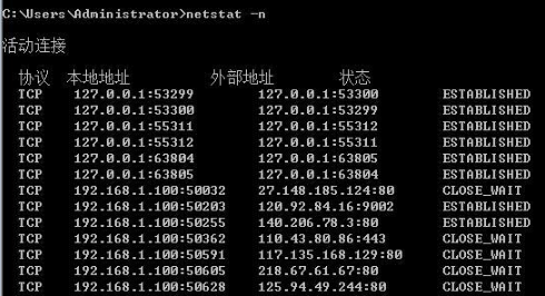 我們打開(kāi)cmd,輸入netstat -n 可以看到我們正在使用的端口,已經(jīng)連接外網(wǎng)的哪些ip和端口 。
