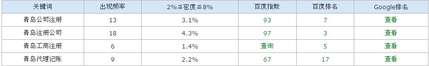 從這個圖上可以分析出來,青島注冊公司這個詞密度是4.3%,排名是第3。也就是說關(guān)鍵詞密度大,排名也就越來。再一方面就是關(guān)鍵詞出現(xiàn)的位置。一般來說,標題關(guān)鍵詞的位置越靠前,排名就越好。對于標題,描述,關(guān)鍵詞標簽這三方面來說,簡潔明朗是最基本的。例如 站長之家 - 中國站長站 CHINAZ.com | 我們致力于為中文網(wǎng)站提供動力! 這個標題就很簡潔明了,不超過30個字,也突出了網(wǎng)站的主題,大家可以好好的借鑒一下。描述和關(guān)鍵詞描述的寫法同樣如此,主題鮮明,簡單大方,這就是規(guī)范的寫法。