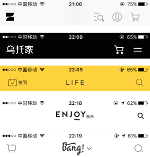 每個(gè)應(yīng)用都有一個(gè)標(biāo)題欄,這成了App的標(biāo)準(zhǔn)設(shè)計(jì)了。標(biāo)題欄上一般會(huì)有三個(gè)重要的元素組成:logo圖形或者文字、搜索頁的入口、購(gòu)物車的圖標(biāo)。