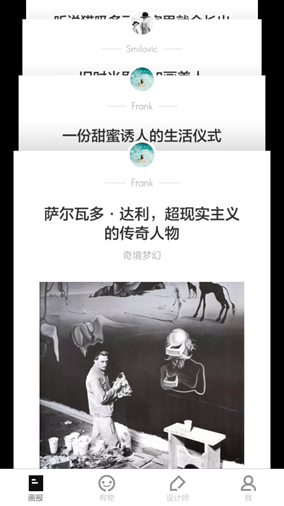Tab標(biāo)簽欄如果類別比較多的時(shí)候采用橫滑的設(shè)計(jì)形式。如果應(yīng)用的頻道比較少,例如造作應(yīng)用(圖1-7),甚至可以直接把標(biāo)簽欄設(shè)計(jì)在底部,相當(dāng)于整個(gè)底部標(biāo)簽欄的作用,當(dāng)然底部標(biāo)簽欄重要的“我的”模塊,入口放置在頂部標(biāo)題欄上。