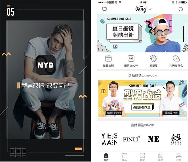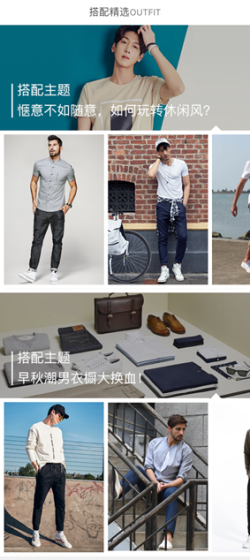 下半部分Banner采用了176*176PX(1:1)的小圖。這樣圖片比例符合之前分析的專題圖適合16:9,商品圖適合用1:1。這樣的大小比例看起來可以讓版塊之前區(qū)分的很清楚。當(dāng)然如果下半部分圖片一定要使用小圖,否則看起來層次就混亂,。例如男衣邦的首頁,上圖和下圖的比例看起來非常的接近。模塊層次區(qū)分的就不是非常好。