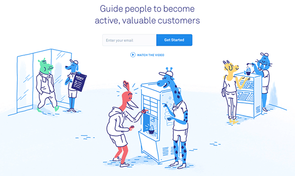 Intercom中插畫(huà)的應(yīng)用更可以幫助其品牌樹(shù)立形象。目前市場(chǎng)上有大量功能相近且設(shè)計(jì)相類(lèi)似的產(chǎn)品,用戶(hù)最終選擇使用的是哪款產(chǎn)品可能就是因?yàn)樗X(jué)得有個(gè)頁(yè)面中那副長(zhǎng)頸鹿插圖很好看。