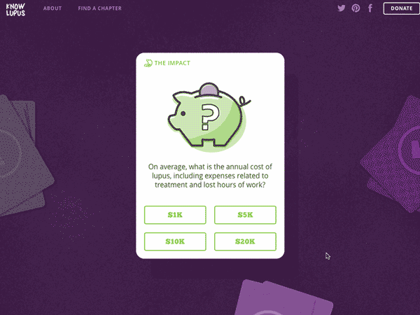 Know Lupus是一個(gè)旨在向人們科普狼瘡這種疾病的網(wǎng)站。我們都知道醫(yī)學(xué)知識(shí)都是比較晦澀難懂的,所以學(xué)習(xí)過(guò)程比較枯燥。為了改變這個(gè)窘境,設(shè)計(jì)師們將學(xué)習(xí)過(guò)程做成了一個(gè)卡片問(wèn)答游戲。寓教于樂(lè),并且引入了插畫(huà)和動(dòng)效,使整個(gè)學(xué)習(xí)過(guò)程充滿(mǎn)了趣味性。