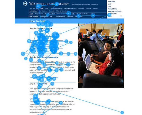 這是一個(gè)大學(xué)生就業(yè)網(wǎng)站頁(yè)面,左邊是一些重要的就業(yè)信息,右邊是一張兩個(gè)大學(xué)生的配圖。藍(lán)色的小點(diǎn)代表了用戶(hù)注意力所分布的區(qū)域,研究表明在有更為重要內(nèi)容的前提下或者圖像本身不具有任何意義,圖像僅作為一個(gè)裝飾物的存在很容易被用戶(hù)忽視。
