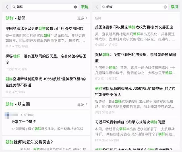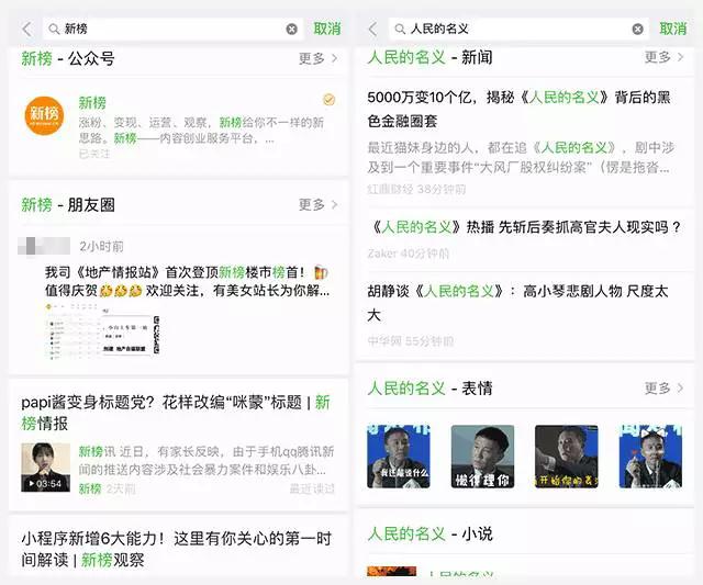 榜哥進(jìn)一步測(cè)試和觀察發(fā)現(xiàn),并非所有關(guān)鍵詞搜索都會(huì)出現(xiàn)“新聞”搜索結(jié)果,比如搜索“新榜”、“微信指數(shù)”就不會(huì)出現(xiàn)相關(guān)外鏈,但輸入“人民的名義”、“朝鮮”等熱門關(guān)鍵詞搜索,就會(huì)出現(xiàn)站外的新聞信息內(nèi)容。