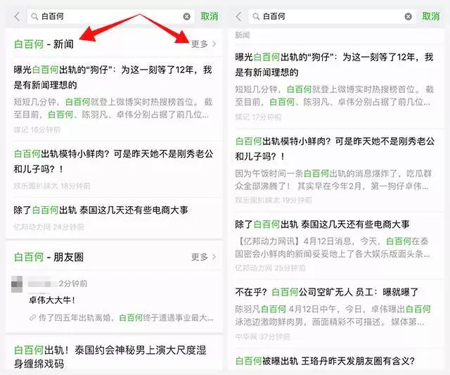 經(jīng)榜哥調(diào)查核實(shí),在微信頂部搜索欄輸入一些關(guān)鍵詞后,比如“白百何”,呈現(xiàn)在搜索結(jié)果最上方的是“新聞”——有大量來自微信站外新聞網(wǎng)站的信息內(nèi)容鏈接。