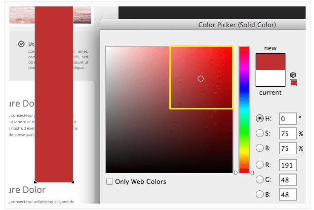 開始在你的基礎圖上拉一個強調(diào)色的矩形框,這樣你可以衡量顏色是否與頁面上所有的元素匹配。然后打開顏色選擇器,選擇在顏色面板右上角四分之一中心位置的顏色。