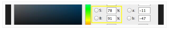當你向上拖動選擇點的時候,你減少了黑色的量,提高了亮度,因此,拾色器上的“B”值就上升了。當向下拖動選擇點的時候,你增加了黑色,“B”值就下降了。