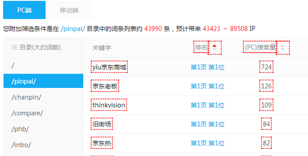 我們可以清晰的看到僅/pinpai/這個(gè)欄目頁,就創(chuàng)建了僅 4 萬條的關(guān)鍵詞排名,預(yù)估可以帶來4.3-8. 9 萬個(gè)IP。可見,有效的優(yōu)化電商網(wǎng)站的分類頁面,從URL的角度給你帶來源源不斷的流量。