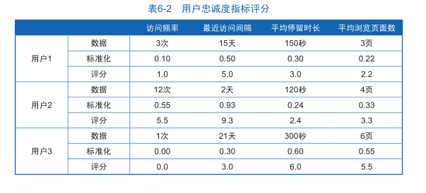 表6-2中,用戶(hù)忠誠(chéng)度的4個(gè)分析指標(biāo)經(jīng)過(guò)標(biāo)準(zhǔn)化處理后統(tǒng)一以10分制的形式輸出,這樣就能直接區(qū)分每個(gè)用戶(hù)的每項(xiàng)指標(biāo)的表現(xiàn)好壞。基于每個(gè)指標(biāo)的評(píng)分,可以對(duì)用戶(hù)進(jìn)行篩選,比如營(yíng)銷(xiāo)部門(mén)重點(diǎn)跟進(jìn)經(jīng)常訪問(wèn)網(wǎng)站的用戶(hù),可以選擇訪問(wèn)頻率評(píng)分大于3分的用戶(hù),或者重點(diǎn)跟進(jìn)用戶(hù)訪問(wèn)參與度較高的用戶(hù),可以篩選平均停留時(shí)間和平均訪問(wèn)頁(yè)面數(shù)都大于3分的用戶(hù),這樣能夠幫助營(yíng)銷(xiāo)部門(mén)迅速定位忠誠(chéng)用戶(hù)。