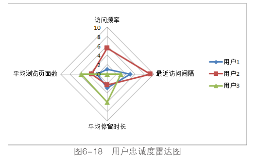 圖6-18使用了表6-2中三位用戶(hù)的評(píng)分?jǐn)?shù)據(jù)繪制而成,能夠非常形象地表現(xiàn)用戶(hù)忠誠(chéng)度在各指標(biāo)上的表現(xiàn)情況,用戶(hù)1的整體忠誠(chéng)度較低,用戶(hù)2在訪問(wèn)頻率和訪問(wèn)間隔具有較好表現(xiàn),而用戶(hù)aki訪問(wèn)具有相對(duì)較高的參與度。使用雷達(dá)圖分析用戶(hù)的忠誠(chéng)度主要有如下優(yōu)勢(shì):
