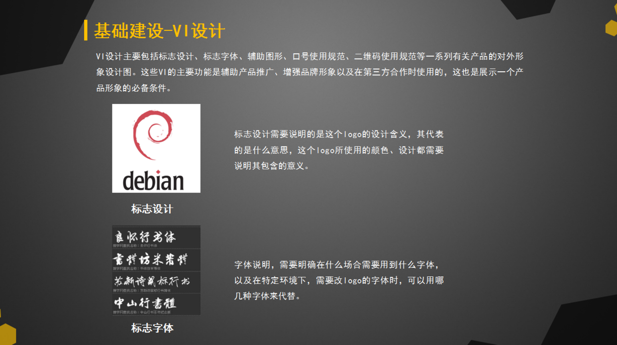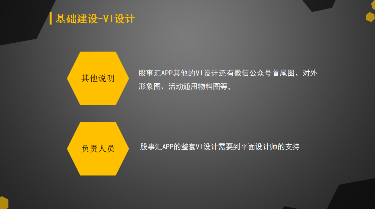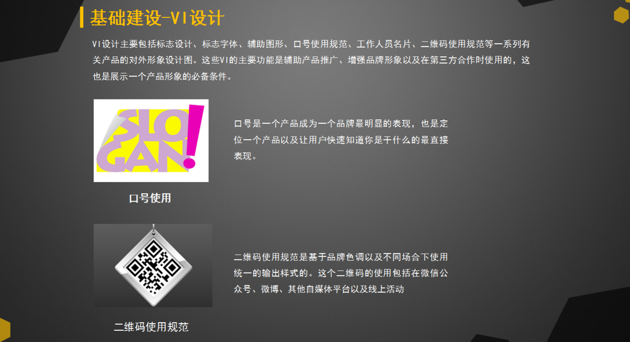 VI設(shè)計主要包括標(biāo)志設(shè)計、標(biāo)志字體、輔助圖形、口號使用規(guī)范、二維碼使用規(guī)范等一系列有關(guān)產(chǎn)品的對外形象設(shè)計圖。這些VI的主要功能是輔助產(chǎn)品推廣、增強(qiáng)品牌形象以及在第三方合作時使用的,這也是展示一個產(chǎn)品形象的必備條件。另外在做產(chǎn)品運(yùn)營方案時,你還要說做這個工作需要誰來負(fù)責(zé),這樣責(zé)任到位。