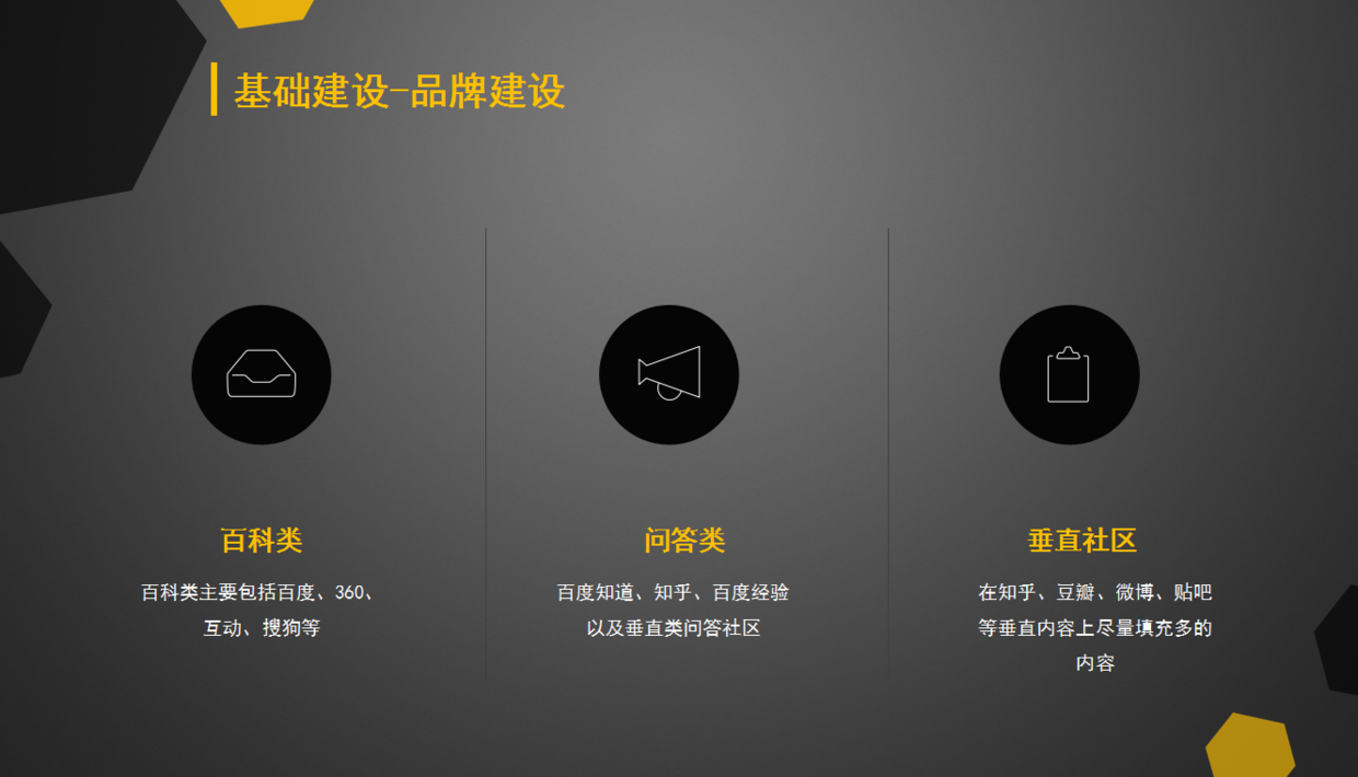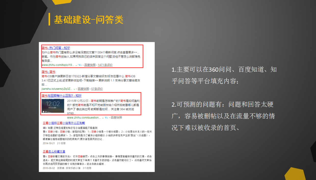 品牌建設(shè)主要包括百科類(百科類主要包括百度、360、互動、搜狗等),問答類(百度知道、知乎、百度經(jīng)驗以及垂直類問答社區(qū));垂直社區(qū)(在知乎、豆瓣、微博、貼吧等垂直內(nèi)容上盡量填充多的內(nèi)容)三大塊去建設(shè)。比如我列舉了在做百科詞條時,我需要做成一個什么樣的效果,優(yōu)化之后,能達(dá)到前四位都是關(guān)于股事匯APP的相關(guān)信息入口(廣告關(guān)鍵詞被購買除外);最好的排位狀態(tài)是:官方網(wǎng)站、百科、應(yīng)用下載、以及其他的垂直社區(qū)內(nèi)容展現(xiàn);還有會遇到的問題:可預(yù)測的問題有:百科賬號等級、營銷利益太強(qiáng)不容易過審等等問題。