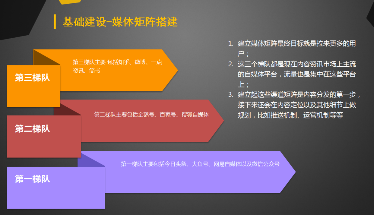 建立媒體矩陣最終目標(biāo)就是拉來更多的用戶,這三個梯隊都是現(xiàn)在內(nèi)容資訊市場上主流的自媒體平臺,流量也是集中在這些平臺上;建立起這些渠道矩陣是內(nèi)容分發(fā)的第一步,接下來還應(yīng)該在內(nèi)容定位以及其他細(xì)節(jié)上做規(guī)劃,比如推送機(jī)制、運(yùn)營機(jī)制等等。包括后面的這個核爆矩陣,其實也是把自家產(chǎn)品放在了第一位,其他新媒體平臺都是圍繞他分發(fā)內(nèi)容。