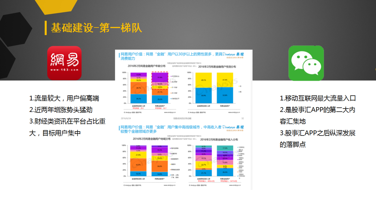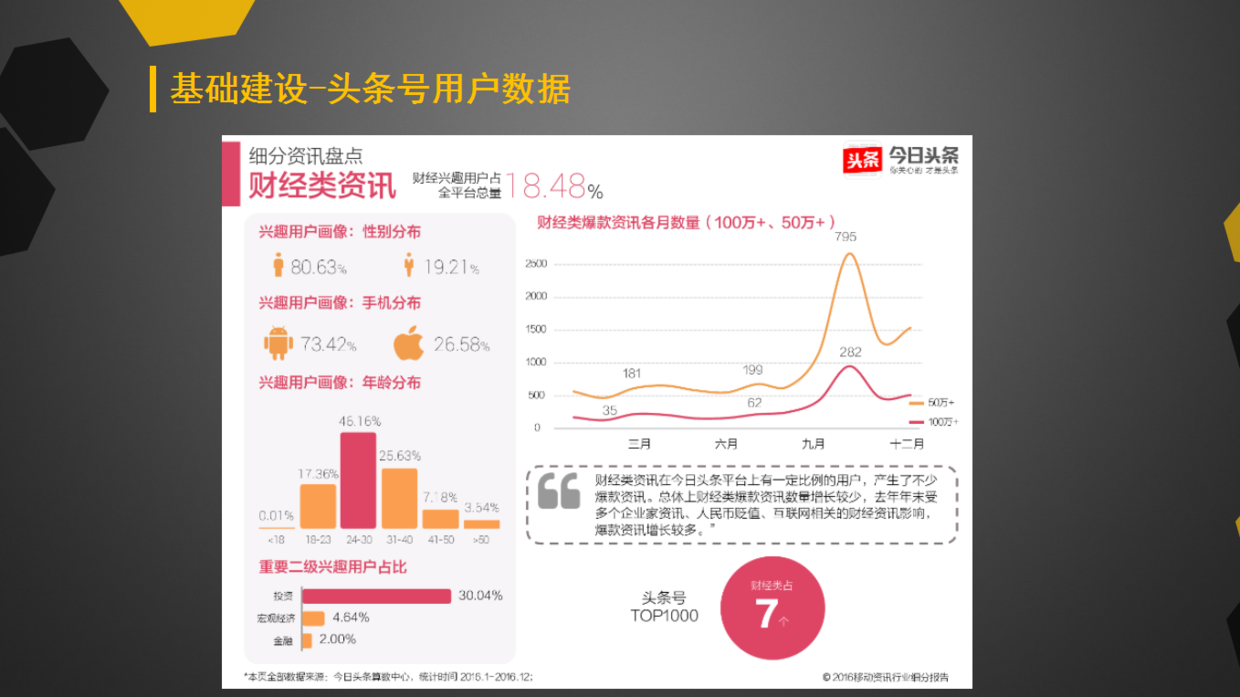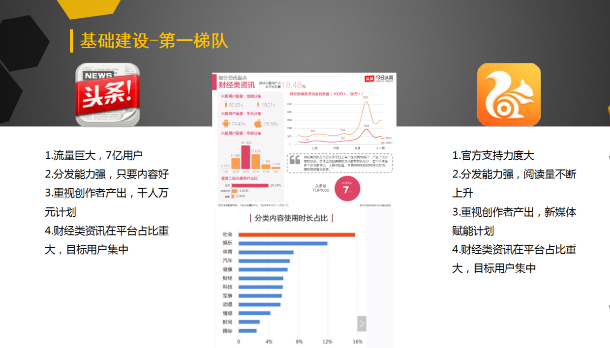 為了能夠說明為啥要把微信公眾號、今日頭條、網(wǎng)易和uc作為第一梯隊,特意列舉了一些數(shù)據(jù),因為我們的產(chǎn)品是一款財經(jīng)類的產(chǎn)品,所以你得清楚各個平臺的目標(biāo)人群定位都是有哪些人,只要知道了產(chǎn)品的目標(biāo)人群在哪里,才好瞄準(zhǔn)打哪里。