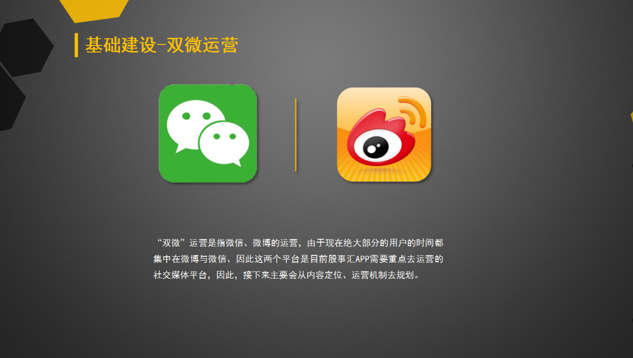 “雙微”運(yùn)營是指微信、微博的運(yùn)營,由于現(xiàn)在絕大部分的用戶的時間都集中在微博與微信、因此這兩個平臺是目前股事匯APP需要重點(diǎn)去運(yùn)營的社交媒體平臺,因此,接下來主要會從內(nèi)容定位、運(yùn)營機(jī)制去規(guī)劃。